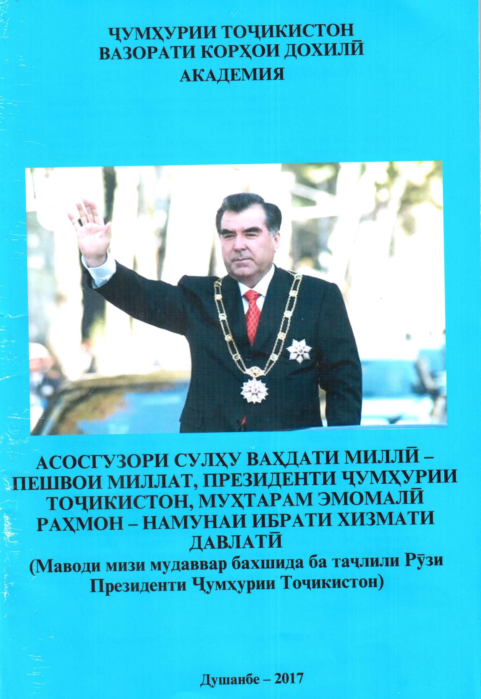 Бахшида ба таҷлили «Рӯзи Президенти Ҷумҳурии Тоҷикистон» дар Академияи ВКД маводи мизи мудаввар зери унвони «Асосгузори сулҳу ваҳдати миллӣ, Пешвои миллат, Президенти Ҷумҳурии Тоҷикистон муҳтарам Эмомалӣ Раҳмон – намунаи ибрати хизмати давлатӣ» аз чоп баромад.